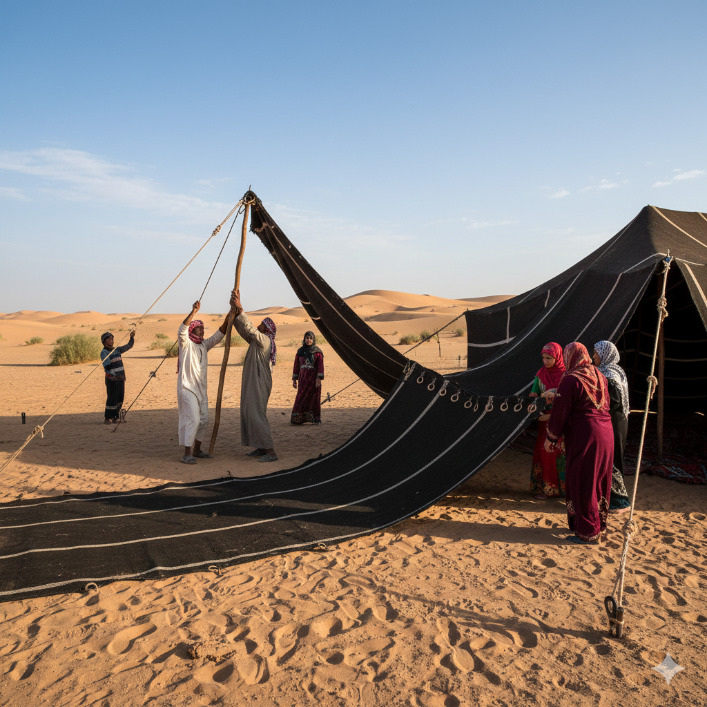بيت الشعر البدوي: تاريخ حيّ، هندسة عبقرية، وكنز من التراثبيت الشعر (Bayt al-Sha‘r – بَيْت الشَّعْر) ليس مجرد خيمة، بل هو بيت كامل متكامل يحمل في طيّاته حكمة آلاف السنين من العيش في الصحراء. لونه الأسود الداكن الذي يمتص حرارة الشمس شتاءً، ويتفتّح خيوطه صيفًا ليسمح للنسيم بالمرور، جعله رمزًا للتوازن بين الإنسان وطبيعة قاسية. في هذا المقال الشامل سنتجوّل داخل هذا البيت العجيب، نستقصي كل جزء فيه، كل اسم يطلق عليه عند القبائل، كل أداة، كل عادة، مع ذكر طريقة نطق كل مصطلح بالحروف اللاتينية لتسهيل القراءة على الجميع.أصل المادة: لماذا شعر الماعز وليس الصوف؟بيت الشعر يُنسج أساسًا من شعر الماعز الأسود (Sha‘r al-Ma‘z – شَعْر المَعِز)، وأجوده ما كان خالصًا دون خلط بشعر الخراف. يتم حلق الماعز (Halq – حَلْق) وليس جزّها، ثم يُغزل الشعر بخيطين (فتلتين) ليصبح متينًا، ثم تُنسج منه شرائح طويلة تُسمى الفلْيجة (جمع: الفلائج – Flayjah / Falā’ij – فْلَيْجَة / فَلَائِج).أما الصوف (Sūf – صُوف) فيُستخدم فقط في الأجزاء الداخلية والمكملات لأنه أثقل ويحبس الهواء أكثر من اللازم إذا استُعمل في السقف. قديمًا، وفي حالات نادرة جدًا، كانت تُنسج بيوت كاملة من وبر الإبل (Wabar al-Ibil – وَبَر الإبِل) وتُسمى البَجَاد (البجاد – Bajād – بَجَاد)، وهي بيوت مخططة بيضاء وسوداء، غالية الثمن جدًا وشبه منقرضة اليوم.وحتى القرن التاسع عشر، كان بعض البدو – خاصة في شمال الجزيرة العربية – يستخدمون الجلود فقط، فيبنون ما يُسمى النّطَع (بفتح الطاء: Naṭa‘ – نَطَع) أو النّطْع (بسكون الطاء: Nuṭ‘ – نُطْع)، ويُلقب أيضًا القَشْع (Qash‘ – قَشْع) أو المَباناة (Mabānāh – مَبَانَاة). الرحالة الألماني كارل رسوان (عام 1912 م) وصف خيمة كاملة من جلود الغزلان مخيطة، أوتادها قرون بقر وحشي!لماذا بيت الشعر مثالي للصحراء؟ (خمس مميزات علمية وعملية)اللون الأسود يمتص الحرارة شتاءً → دافئ.
