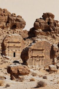 - الآثار: بقايا مادية من عصور قديمة (غالبًا أكثر من قرن)، مثل المواقع الأثرية والنقوش واللقى. من أمثلتها: فنون الصخور في حائل، مدينة الفاو الأثرية، والكتابات الثمودية المنتشرة في أنحاء الجزيرة، شواهد صامتة على حضارات مرت قبل الإسلام.