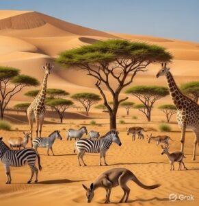 وتم اكتشاف صور ورسومات ومنحوتات تدل على أن الانسان عاش يصطاد الفرائس من الحيوانات التي لا تتواجد غير في مناخ السافانا ويستحيل تواجدها في مناخ صحراوي.